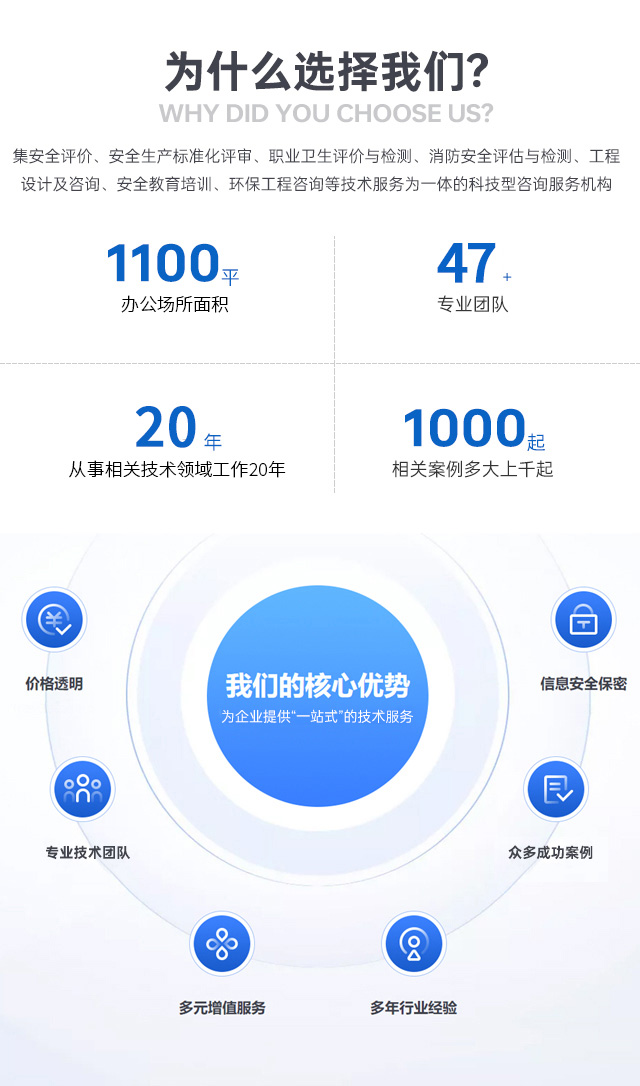 公司注册资金500万,地址位于合肥市包河区南二环路加侨国际广场写字楼B栋,目前拥有办公场所面积1100平方米,员工47人,其中技术人员100%具有大专以上学历,公司骨干多为安全技术、消防技术、职业卫生、检测、检验技术精英,部分人员已经从事相关技术领域工作三十多年。技术服务范围涵盖矿山、金属冶炼、有色金属、化工、石油、电力、电子、机械、轻工等诸多行业。公司严格按照体系要求进行各项技术服务。公司检测设备齐全,检测手段完善。